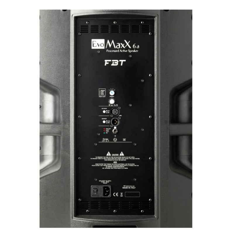 Усилитель системы относится к классу D, что делает его крайне эффективным и мощным (500 Ватт в непрерывном режиме, 1000 Ватт в пиковом режиме). Система оснащена динамиками B&C Custom - 15-дюймовым низкочастотным динамиком с 2,5-дюймовой катушкой и 1-дюймовым высокочастотным динамиком с 1,7-дюймовой катушкой. Здесь есть совмещенные разъемы XLR и TRS, ручка регулировки громкости, переключатель режимов эквалайзера и три светодиодных индикатора статуса. Максимальный уровень звукового давления системы - 130 дБ, частотный диапазон - от 42 Гц до 20 кГц. Кабинет системы изготовлен из полипропилена и может быть установлен как напольный монитор, в подвесе или на стойку. Активная акустическая система FBT EVOMaxX 6A - мощная качественная система с отличным звучанием.