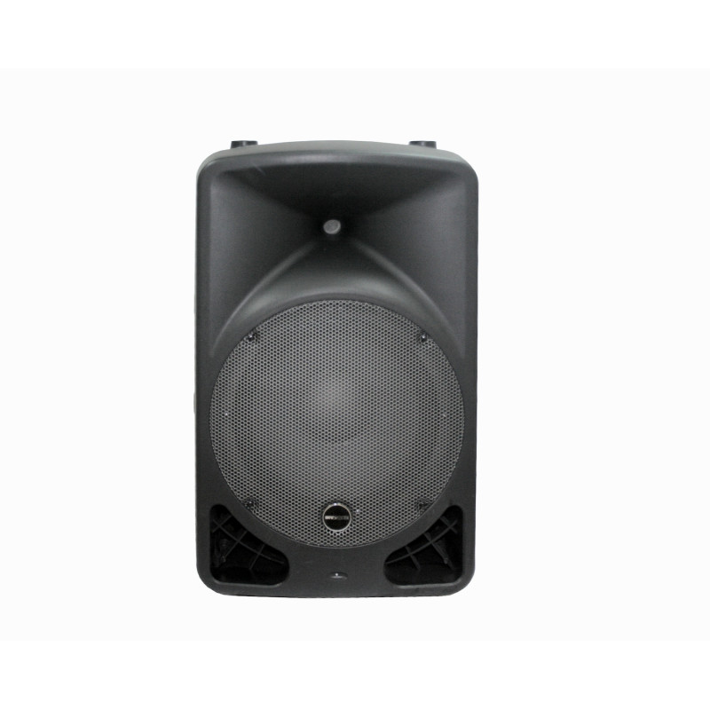Кабинет: выполнен из прочного пластика, трапециидальной формы с возможностью использования акустической системы в качестве монитора, 2 ручки для переноски с двух сторон. На корпусе рассположены 6 точек для подвеса M10. Снизу расположен стандартный 36 mm адаптер для установки акустической системы на стойку.