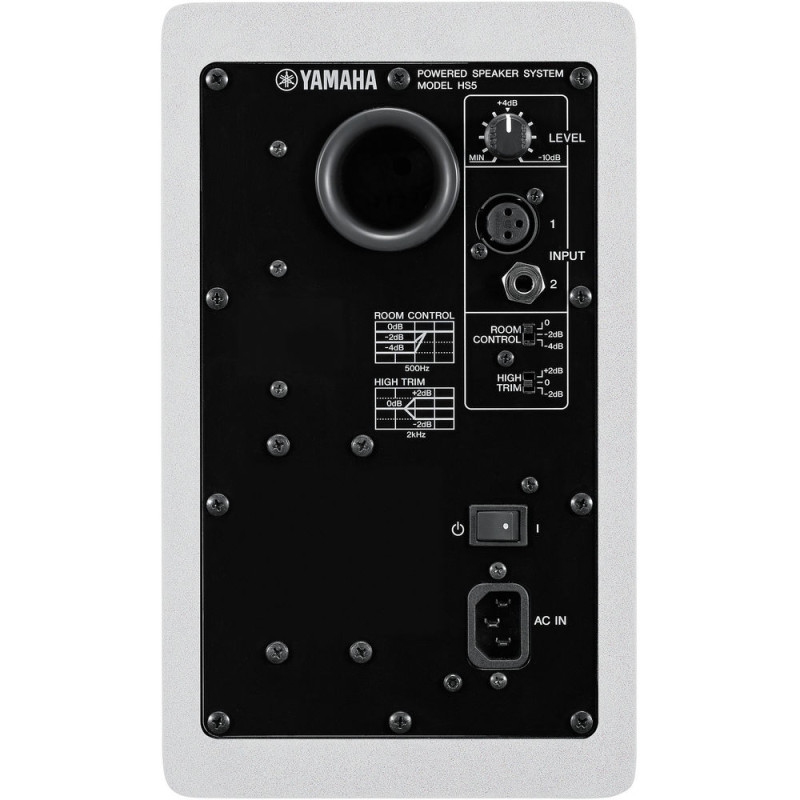В корпусе Yamaha HS5 находится два усилителя мощностью 45 и 25 Вт. На тыльной поверхности кабинета находится два балансных входа: один XLR и один 1/4" TRS Jack. Там же можно найти регулятор громкости и два переключателя HIGH TRIM и ROOM CONTROL: первый управляет работой ВЧ-усилителей, уменьшая или увеличивая уровень сигнала на +/- 2 дБ, а второй переключатель подстраивает нижнечастотный диапазон (0/-2/-4 дБ), помогая избежать ненужных отражений. Переключатели рекомендуется использовать для подстройки в соответствии с конфигурацией помещения, а также рекомендуется использовать данные мониторы в связке с сабвуфером Yamaha HS8S.