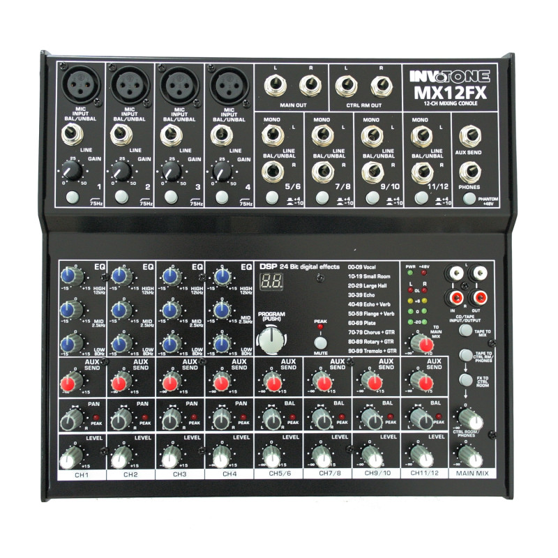 Микшерный пульт - 4 микрофонных входа XLR Jack, 4 стерео входа с балансными TRS джеками.На микрофонных каналах ручка Gain и фантомное питание + 48 V и кнопка Low Cut 75Hz. 1post fader Aux для посыла эффектов c переключением в режим pre для посыла сигнала в монитор.2-Track IN/OUT с возможностью назначения выхода в Main Mix или CTRL Room out. Балансные выходы как на джеках так и на XLR Встроенный цифровой процессор эффектов со 100 эффектами(24bit).