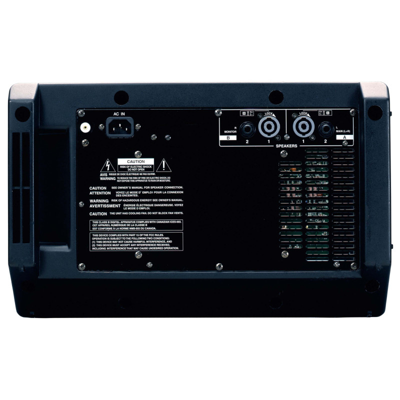 В разделе микшера расположено 12 входов в универсальной конфигурации: каналы 1-4 - это моновходы микрофон/линия, каналы 5/6 и 7/8 могут работать как моновходы микрофон/линия или линейные стереовходы, каналы 9/10 и 11/12 являются линейными стереовходами. Для подключения к внешним усилителям мощности и процессорам эффектов есть выделенные разъемы. В стереоканалах 9/10 и 11/12 есть стереоразъемы для прямого подключения CD-плееров или других устройств воспроизведения, к которым при необходимости можно применить 3-полосные эквалайзеры. Также представлены два 7-полосных графических эквалайзеры, которые можно использовать для сопоставления характеристик колонок и помещения для получения оптимального звука.