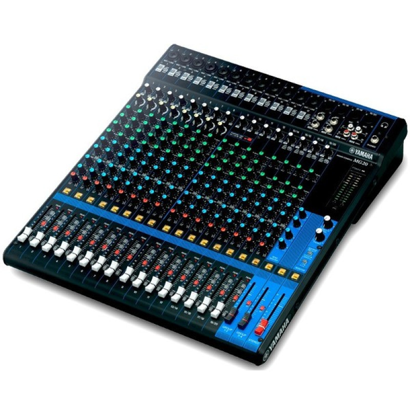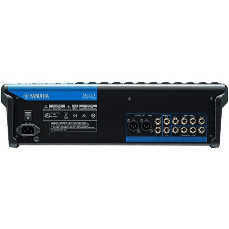 На борту Yamaha MG20 находится 12 комбинированных входов XLR/TRS 1/4" Jack с микрофонными предусилителями, аттенюаторами 26 дБ, фантомным питанием +48 Вольт и НЧ-фильтром 80 Гц. Данный тип входов позволяет использовать как динамические, так и конденсаторные микрофоны, не говоря уже о линейных источниках. На этих входах находятся также фирменные компрессоры, регулируемые поворотными ручками. Кроме того, на всех каналах есть ручки гейна с усилением до +64 дБ, трехполосные эквалайзеры (также в виде ручек, две ручки регулировки средних частот на каналах 1-12) с усилением/ослаблением до +15/-15 дБ и фейдеры регулировки уровня.