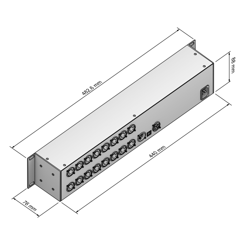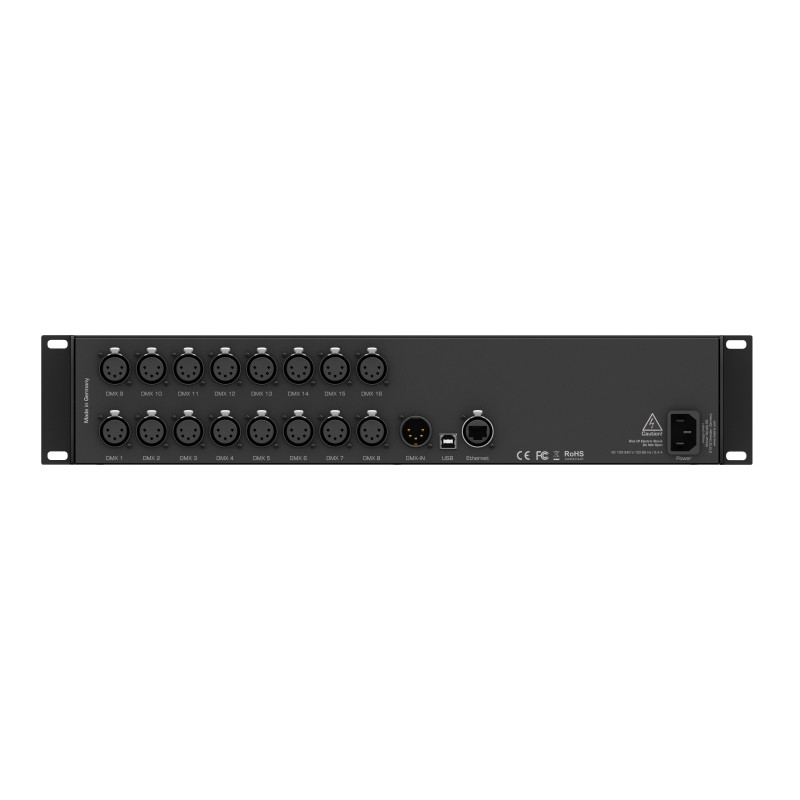 LUNA 16 - универсальный конвертер сигналов управления протокола Art-Net в сигналы DMX-512, использует стандартные сети Ethernet или Plug and Play подключание к компьютеру по USB 2.0. 16 XLR разъёма (5-пин, «мама») распределяют каждый по одному DMX-потоку. 1 разъем XLR (5-пин, «папа») используется как DMX-вход для управления программами MADRIX c внешнего пульта DMX-512. Имеет стандартные размеры для установки в рэковую стойку 19”.