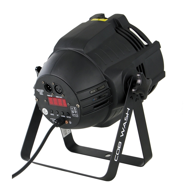 Прожектор COBPAR100T реагирует на звуки низкой частоты и может подстраивать смену своей цветовой гаммы и пульсацию света в такт музыке. Управление его встроенной электроникой не представляет сложности даже для людей, которые не сталкивались ранее с подобными устройствами. Список удобств дополняют компактные размеры и возможность работы от обычной электросети.