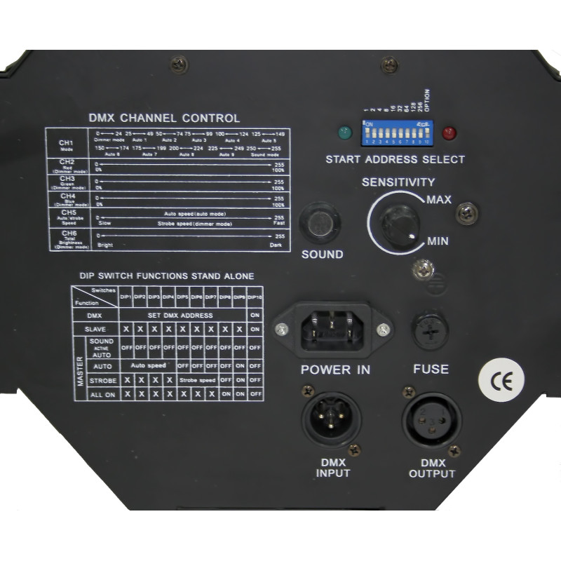 Управление: DMX 512, 6 каналов, звуковая активация, мастер-ведомый. Основное управление через переключатели. Возможность высвечивать буквы латиницы.
