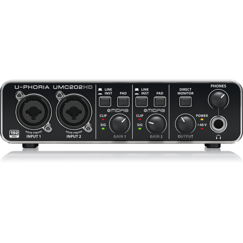 У Behringer U-PHORIA UMC202HD два комбинированных входа на фронтальной панели (микрофонные/инструментальные/линейные). Каждый из входов экипирован микрофонным предусилителем Midas, а также фантомным питанием +48В для конденсаторных микрофонов. У каждого входа есть отдельные регуляторы гейна, переключатели типа входа, а также индикаторы сигнала и клиппинга. Общие элемент управления – в правой части аудиоинтерфейса, это ручка регулировки выходного сигнала OUTPUT с кнопкой прямого мониторинга, а также выход на наушники PHONES с собственной ручкой регулировки. Мониторинг осуществляется с нулевой задержкой.
