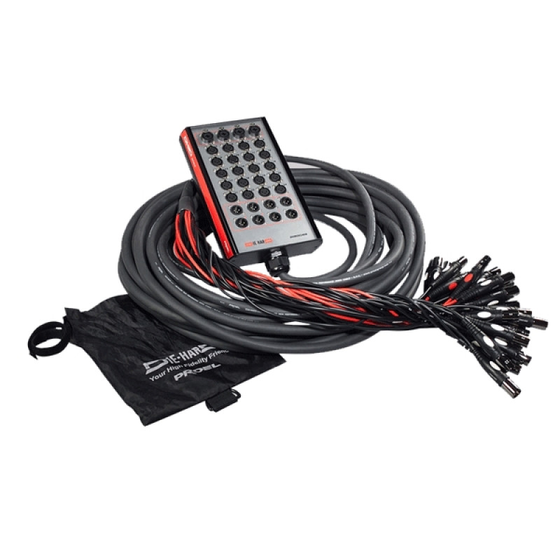 В панель коммутационного блока встроены 20 гнездовых 3-полюсных разъемов типа XLR, 4 гнездовых разъема комбинированного типа (3-полюсный XLR/JACK O 6,3 мм) и 4 штекерных 3-полюсных разъема типа XLR. На профессиональном многожильном аудио кабеле закреплены 24 штекерных 3-полюсных разъема типа XLR и 8 гнездовых 3-полюсных разъемов типа XLR.