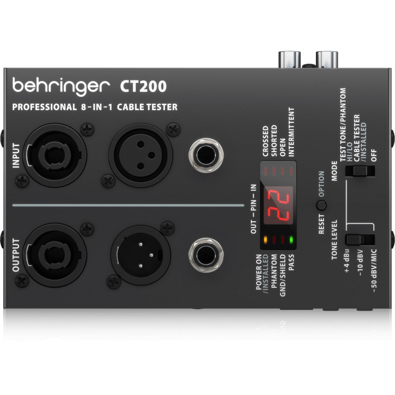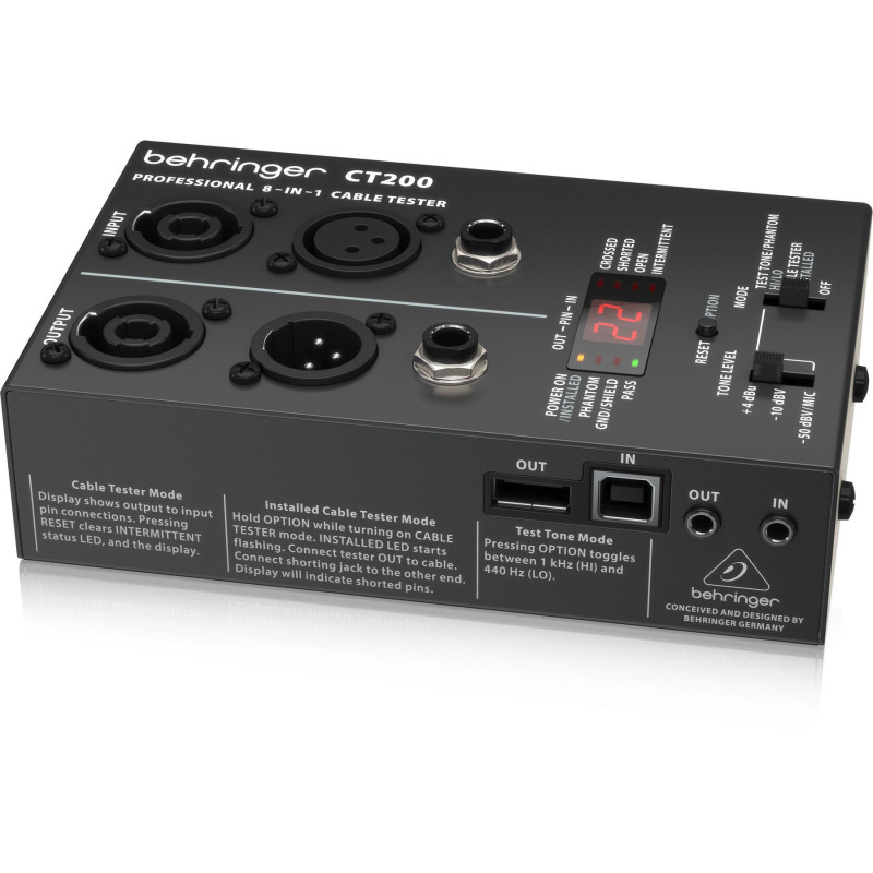 Behringer CT200 кабель-тестер, разъёмы XLR, Speakon, TRS (1/4" и 1/8"), RCA, RJ45, MIDI и USB.