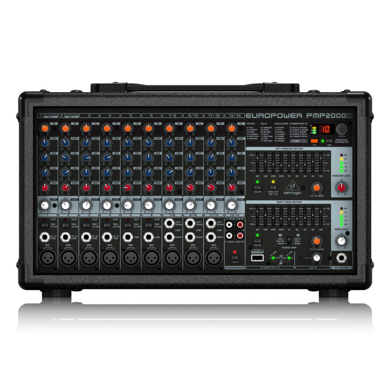 Behringer EUROPOWER PMP2000D – активный 14-канальный микшер с усилителем с процессором KLARK TEKNIK и возможностью беспроводного подключения.
