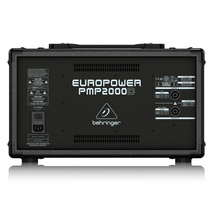 В Behringer EUROPOWER PMP2000D встроены 9 микрофонных предусилителей IMP с переключаемым фантомным питанием +48В для конденсаторных микрофонов. Предусилители обеспечивают весьма впечатляющие 130 дБ динамического диапазона с пропускной способностью от 10 Гц до 200 кГц. Они идеально подходят для любого микрофона с коэффициентом усиления до 60 дБ и фантомным питанием +48В. Доступно 6 монофонических входов, 4 из которых могут работать в высокоимпедансном режиме для прямого подключения инструментов. 4 канала работают в стереорежиме, можно подключить внешние источники в разъем aux in на 3,5 мм mini-Jack, в наличии также две стереопары RCA – на вход и выход. Процессор эффектов KLARK TEKNIK может предложить 25 эффектов студийного качества: их можно наложить на любую дорожку, и они включают в себя ревербераторы, дилэи, корректор высоты тона и различные мультиэффекты, включая девятиполосной стереофонический графический эквалайзер. Процессор работает с движком разрядностью 24 бита для лучшего качества звука.