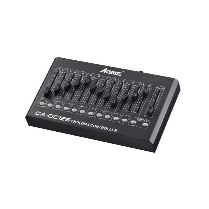 ACME CA-DC12S контроллер DMX, 12 индивидуальных каналов+1 общий (MASTER) канал, 12 программируемых сцен, каждый канал имеет клавишу включения/выключения канала, она же вкл/выключает сцену, компактный дизайн и простота в управлении делает прибор незаменимым в небольших инсталляциях.