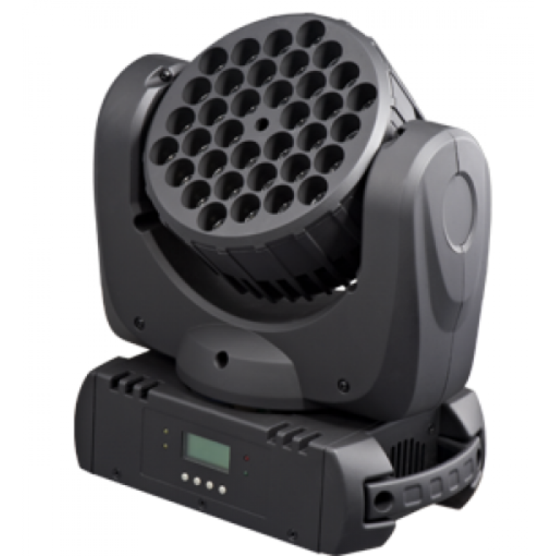 мощная светодиодная вращающаяся голова заливного света(типа Wash). DMX управление 12 каналов, встроенные шоу для работы в режиме звуковой активации, режим Master/Slave/ RGBW синтез цвета, диммер 0-100%, строб эффект с регулировкой