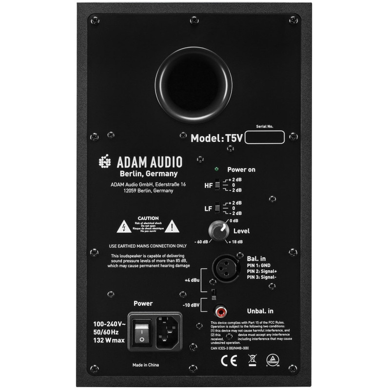 ADAM T5V активный студийный монитор, имеет двухполосную конструкцию с фазоинвертором на задней стенке. За воспроизведение низких частот в них отвечает 5-дюймовый излучатель с диффузором из полипропилена, а высоких – ленточный твитер U-ART, нагруженный на уже знакомый нам по S-серии волновод HPS. Оба динамика совершенно новые, подключены к отдельным каналам работающего в классе D усилителя. Среди прочих особенностей новой АС отметим кроссовер, выполненный на базе DSP, и импульсный источник питания.