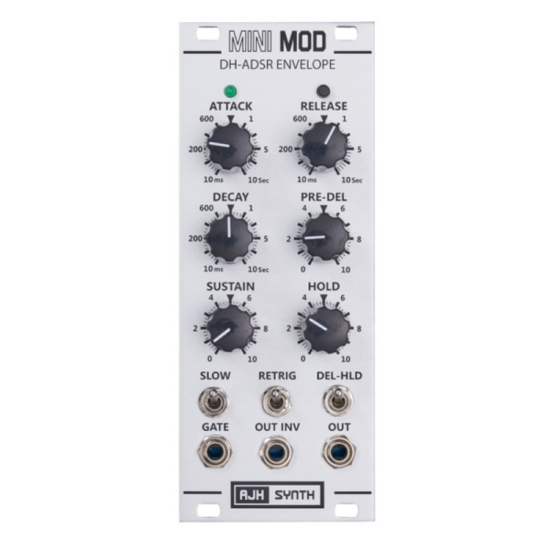 Совершенствование классики - DH-ADSR основан на дизайне огибающей синтезатора Minogoog. Однако, с точки зрения функциональности, модуль AJH намного превосходит схемы винтажного инструмента. Модулятор предлагает полную характеристику ADSR с добавленной секцией «Задержка» и «Удержание». Два диапазона управления для всех чувствительных ко времени параметров позволяют детально редактировать короткие, ударные звуки, а также медленно меняющиеся атмосферы. Опция повторного запуска позволяет использовать схему как сложный LFO. Результаты могут быть отключены от нормального и инвертированного вывода. Несмотря на все эти дополнения, поведение и формы кривой DH-ADSR очень напоминают Minimoog.