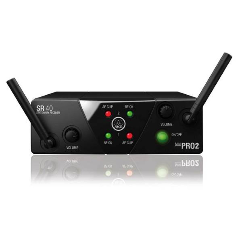 Приёмник SR40 Mini из комплекта AKG WMS40 Mini2 Instrumental Set обеспечивает кристально чистый звук. На его корпусе расположено три светодиода состояния, показывающие состояние включения, мощность принимаемого сигнала (RF OK) и клиппинг сигнала (AF CLIP). На металлическом корпусе ресивера расположен регулятор громкости и большая бесшумная кнопка включения/выключения для защиты подключенных акустических систем. SR40 Mini оснащен одним симметричным (балансным) выходом на разъеме 1/4" Jack. Входящий в комплект универсальный импульсный источник питания работает с напряжением от 120 до 230 Вольт.