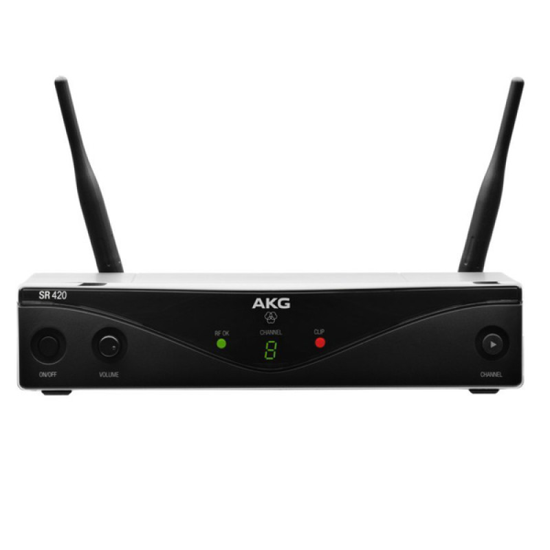 Приёмник с двумя съемными антеннами SR420 из комплекта AKG WMS420 Vocal Set обеспечивает кристально чистый звук. Предустановки допускают выбор из восьми каналов. На его корпусе расположено два светодиода состояния, показывающие мощность принимаемого сигнала (RF OK) и клиппинг (CLIP). Также есть регулятор громкости, кнопка выбора канала (до восьми различных частот) и бесшумная кнопка включения/выключения для защиты подключенных акустических систем. SR420 оснащен двумя выходами: на разъемах XLR и 1/4" TS Jack. Наконец, есть функционал шумоподавления: автоматическая схема бесшумно переключает ресивер, если принятый сигнал слишком слаб, чтобы подавить помехи или фоновый шум приемника. Входящий в комплект универсальный импульсный источник питания работает с напряжением от 110 до 240 Вольт.