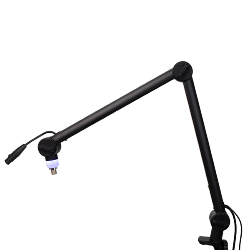 Надежная и прочная, стойка изготовлена из алюминия и качественного пластика. Поставляется с XLR и USB кабелями, оснащена светодиодной подсветкой (красный, синий и фиолетовый на выбор). Стопорный винт регулировки угла наклона микрофона и стопорный винт регулировки угла наклона верхней стойки делают всю подставку гибкой и устойчивой. Оснащена двумя различными основаниями, вставляющееся непосредственно в стол или фиксируемое с помощью зажима на столе. Применяется в вещании, телешоу, студии, домашней записи, проста в установке и использовании.