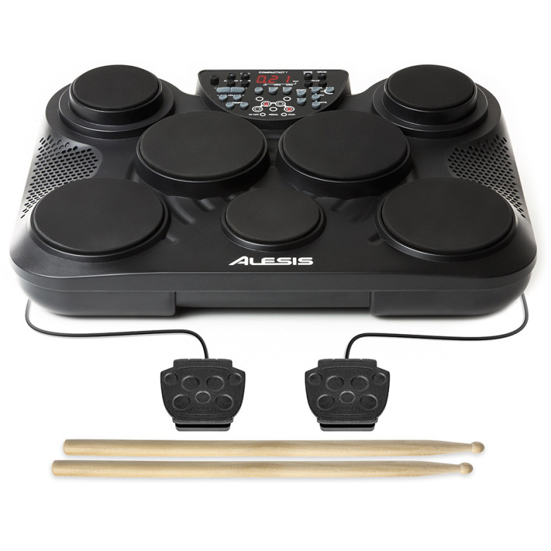 Alesis CompactKit 7 имеет 7 чувствительных к силе нажатия пэдов с отскоком, свойственным настоящим акустическим барабанам, и 2 педали: для бас-бочки и хай-хэта. Доступно 265 предустановленных звуков, которые можно назначать на любые из 7 пэдов. Присутствуют 100 композиций в самых различных стилях музыки, под которые можно практиковаться. Устройство имеет встроенный USB-MIDI интерфейс, с помощью которого можно передавать MIDI-сигнал в компьютер и обрабатывать любыми плагинами, начиная от ударных установок, заканчивая синтезаторами. Доступная функция записи вашего исполнения и сохранения настроек.