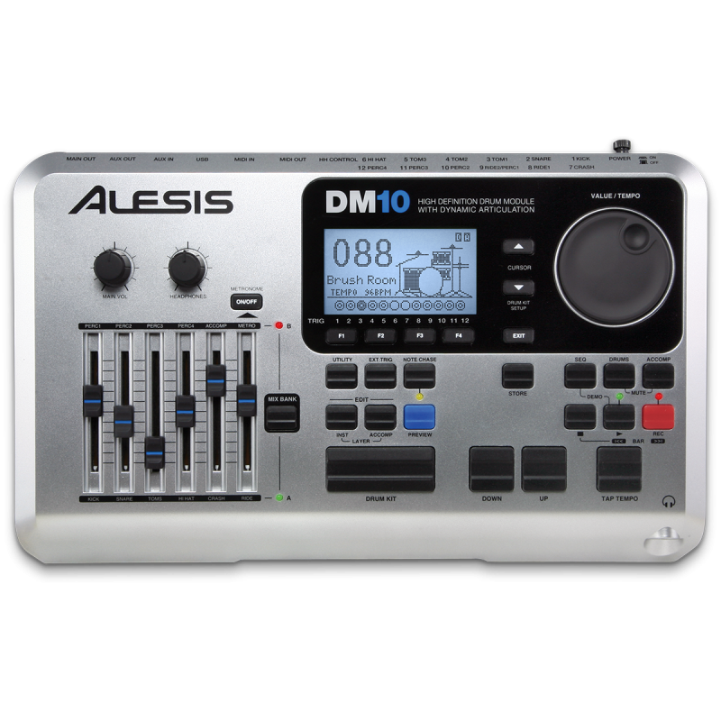 "Сердцем" барабанной установки Alesis DM10 X является модуль DM10. Он точно распознает все нюансы игры, характеризуется большим количеством триггерных входов, широким динамическим диапазоном и интуитивно понятным управлением, имеет микшер на верхней панели, встроенные метроном и секвенсор, две пары аудиовыходов, интерфейсы USB и MIDI. Но главное — это больше 1000 звуков барабанов, засэмплированных в несколько слоев по фирменной технологии Dynamic Articulation™. Среди них можно встретить барабаны ведущих мировых производителей, тарелки из США, Канады, Китая и Турции, а также звуки классических драм-машин и электронных барабанных установок, на которых было записано немало хитов разных лет.