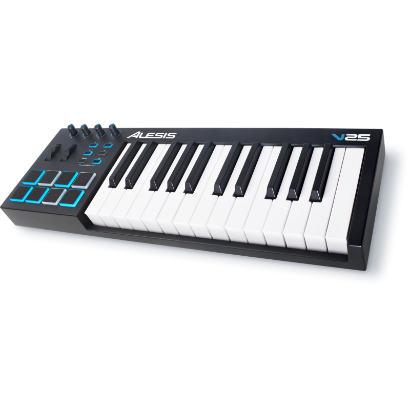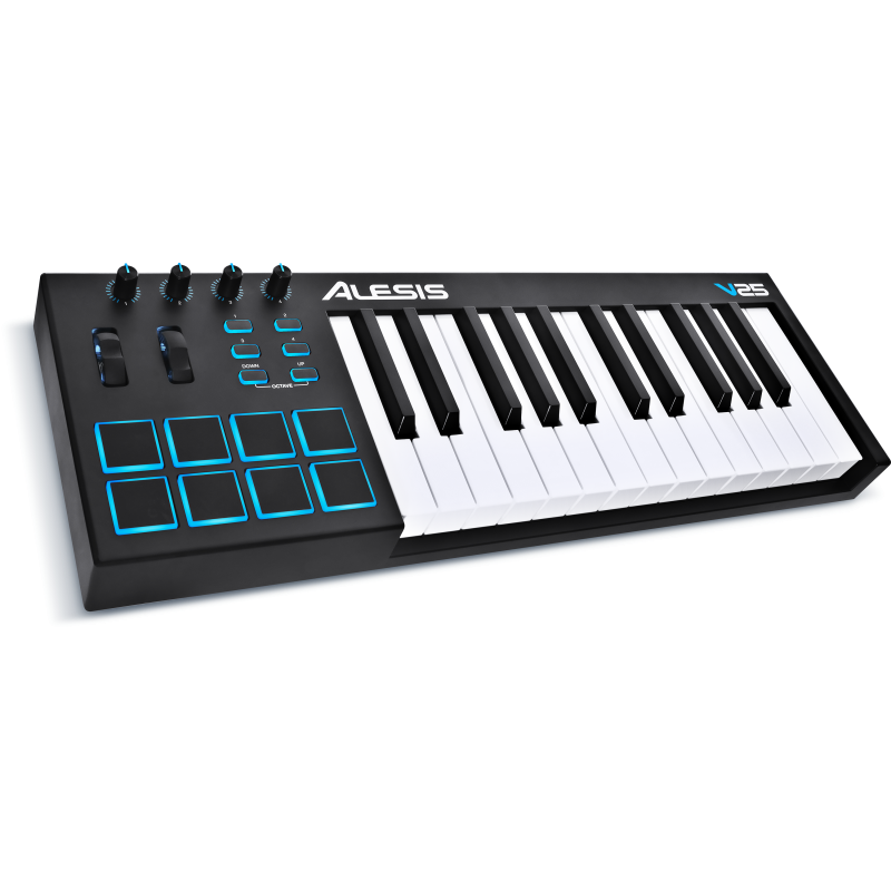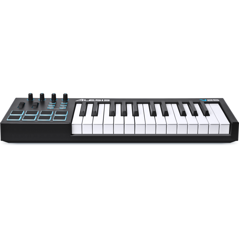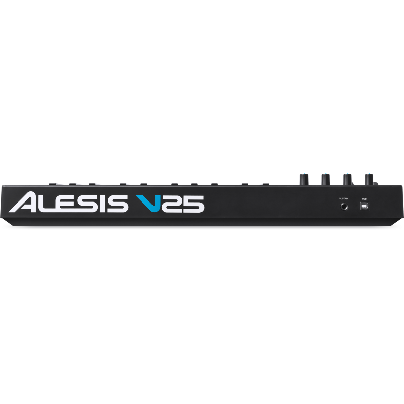 Alesis V25 – это компактная MIDI-клавиатура с 25 полноразмерными клавишами и с секцией управления для широкого спектра применения: от работы на сцене до записи подкастов.