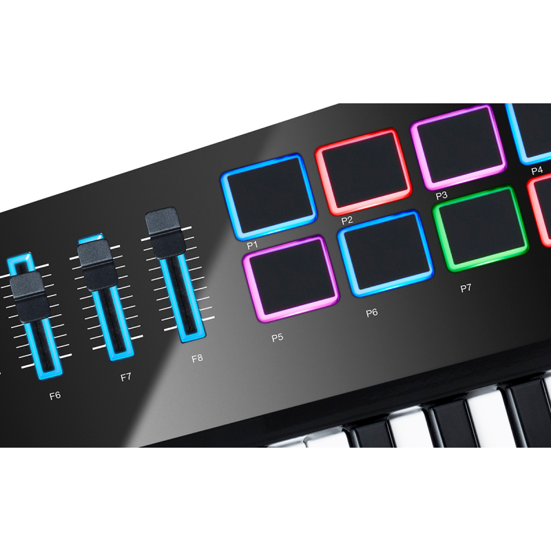 - 8 назначаемых слайдеров с подсветкой, 1 сенсорный контроллер, 1 колесо Pitch Bend