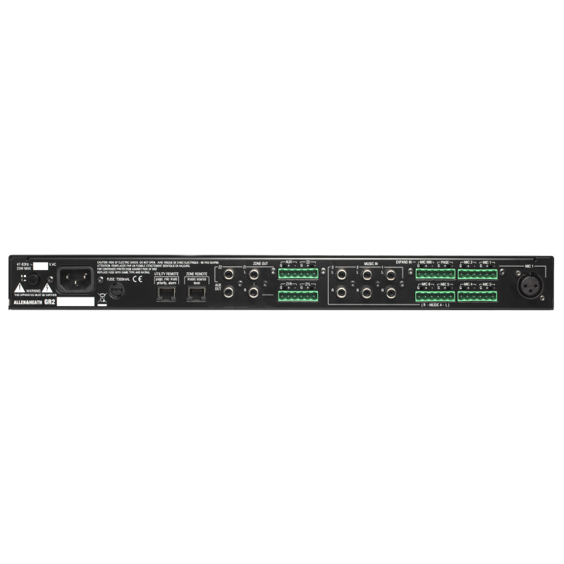 Allen & Heath GR2 - аналоговый зонный микшер, имеющий 9-входов и 4 выхода. Предназначен для звуковых инсталляций, требующих 6 микр./3 стерео линии или 4 микр./4 стерео к 1 стерео/1 моно зоне и выходу Aux. Все установки настраиваются на передней панели и защищены закрывающей панелью. Выбор источника зоны, громкости и т.д. может осуществляться дистанционно.