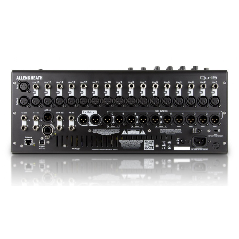 Qu-16 содержит 16 микрофонных / линейных входов, 3 стерео входа, 4 процессора эффектов с отдельными стерео возвратами, 14 миксов (включая LR, 10 AUX-миксов и 2 отдельные FX-шины), 12 микширующих каналов, цифровой выход AES с 2-канальным ALT выходом, вход для Talkback микрофона и 3-трековый выход.