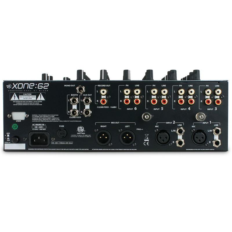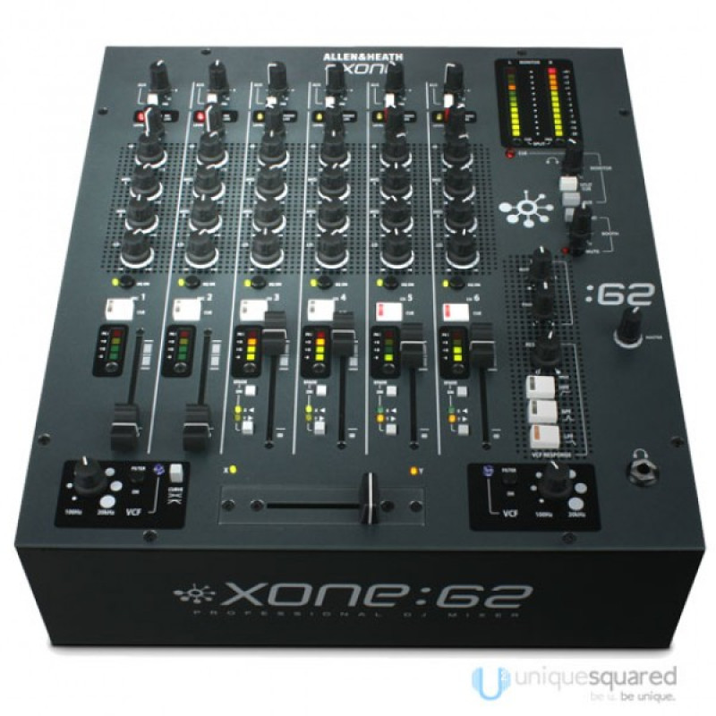 Xone:62 DJ-микшер, 2 микрофонных, 4 двойных стерео входа phono, 2 стерео входа line, VCA кроссфейдер P&G, VCF фильтры