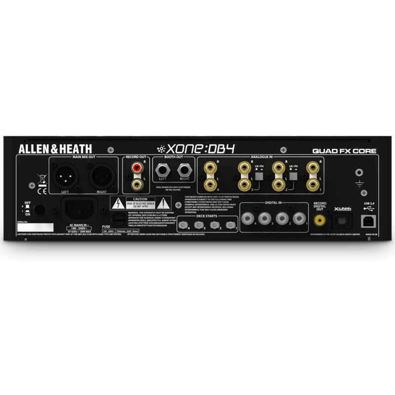 Allen & Heath Xone:DB4 Микшер построен на базе процессора Quad FX Core DSP, имеет на каждом канале процессор эффектов, счетчик BPM, секцию управления петлей и эквалайзер. Другие