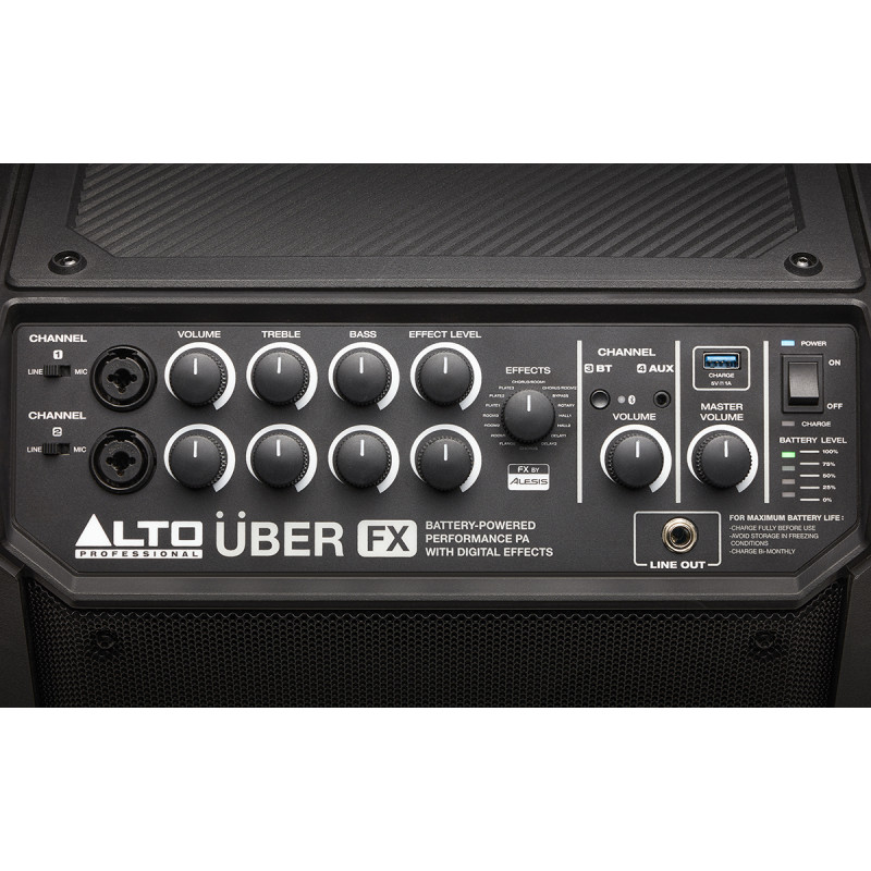 Alto Uber FX – это портативная беспроводная акустическая система с модулем Bluetooth, процессором эффектов и эквалайзером.