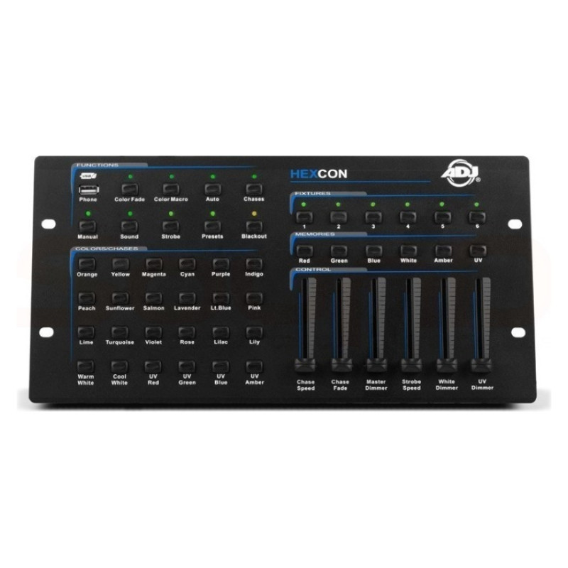 AMERICAN DJ HEXCON - 36-канальный контроллер управления DMX специально разработанный для приборов ADJ серии HEX. Управление до 6 светодиодными приборами RGBAW+UV (или группами приборов) осуществляется независимо посредством 6 кнопок.
