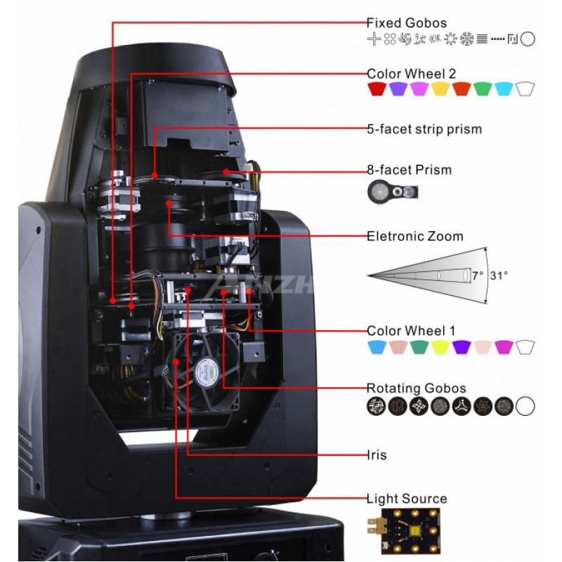 - 2 колесо гобо: 7 вращающихся гобо рисунков + открытый, вращение колеса гобо по и против часовой стрелке, эффект тряски