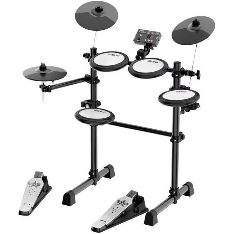 Комплект Aroma TDX-16 состоит из трех пэдов томов, однозонного пэда малого барабана, педали бас-барабана, хай-хэта, педали хай-хэта, пэдов тарелок крэш и райд.