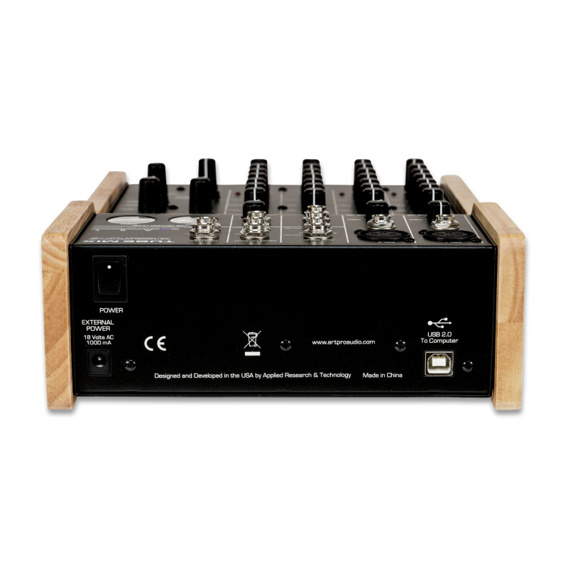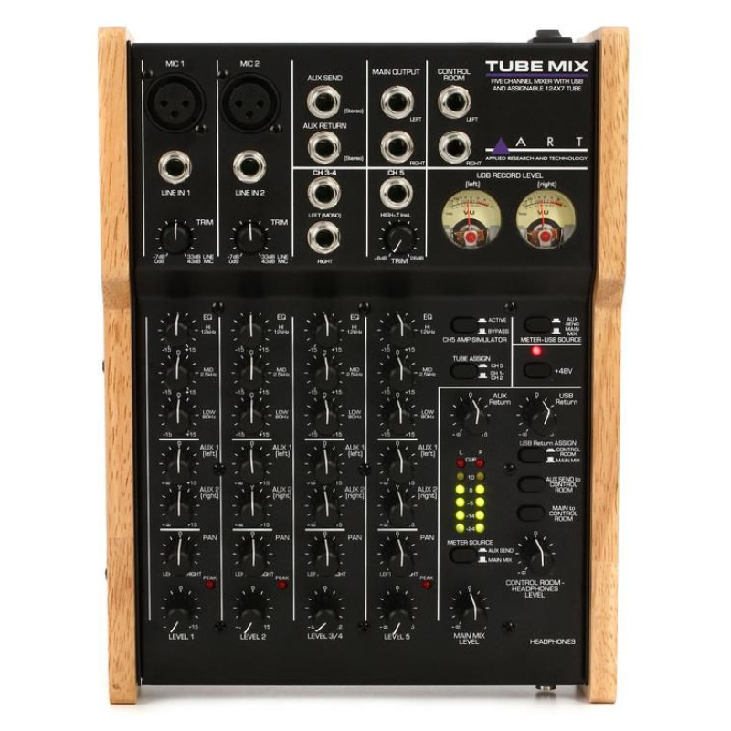 Art TubeMix — компактный микшер с пятью каналами, качественными микрофонными предусилителями (низкий уровень шума), встроенным звуковым интерфейсом USB 2.0, стрелочными прецизионными VU-метрами и гибким блоком Control Room/Headphone.