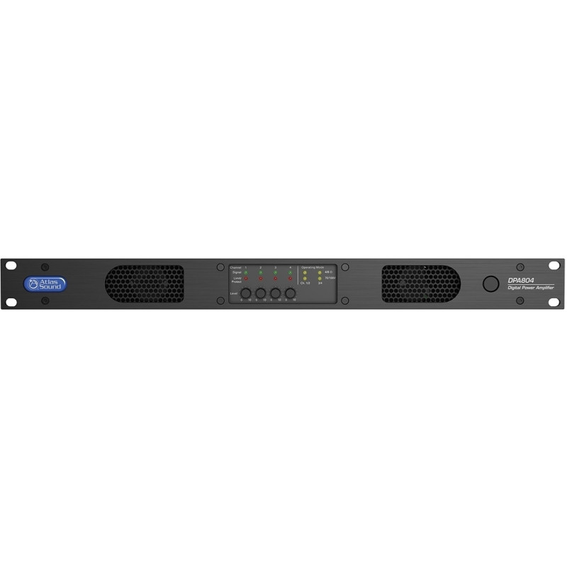 Atlas IED DPA804 – Четырехканальный усилитель мощности с цифровым сигнальным процессором и балансными входами, 4x100 Вт – 4 Ом, 4x150 Вт – 8 Ом, 4х200 Вт – 70/100 В, 2х200 Вт – 70/100 В + 2х100 Вт – 4 Ом, 2х200 Вт – 70/100 В + 2х150 Вт – 8 Ом.