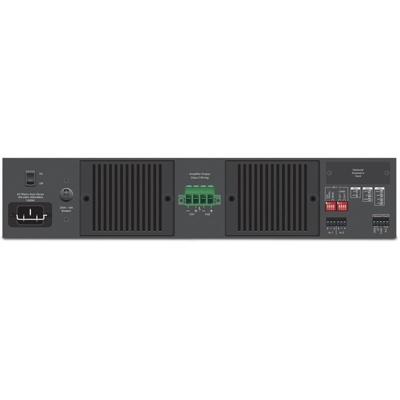 Принудительное охлаждение, защита от перегрева, короткого замыкания и смещения уровня постоянной составляющей, ограничитель уровня сигнала. Усилитель выдает оповещение о неполадках (для использования с логическими входами аудиопроцессора BlueBridge). Удаленное включение, опциональная карта Dante. Высота 2U.
