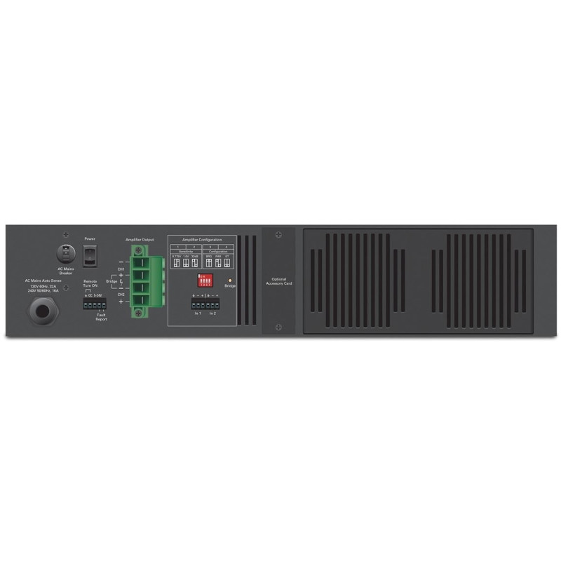 Принудительное охлаждение, защита от перегрева, короткого замыкания и смещения постоянной составляющей, ограничитель уровня сигнала, оповещения о неполадках. Удаленное включение, опциональная карта Dante. Высота 2U.