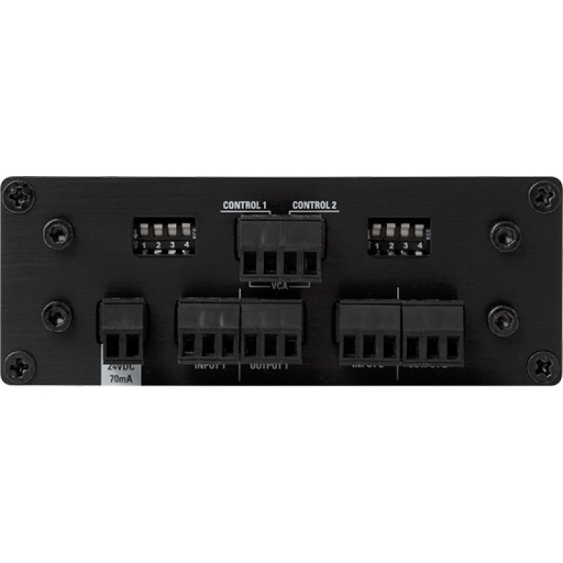 Все разъемы Phoenix, локальное и дистанционное бестрансформаторное управление выходными уровнями по напряжению, подключаемые на входах фантомное питание и заграждающий фильтр низких частот, раздельный выбор микрофонного или линейного уровня на входах и на выходах. Блок питания 24 В приобретается отдельно.