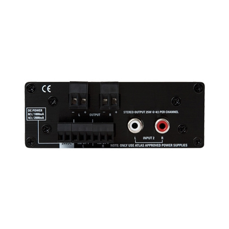 Выходная мощность при нагрузке 4 Ом составляет 25 Вт на канал, а при монофоническом мостовом соединении – 50 Вт на нагрузке 8 Ом. Входной сигнал можно подавать через симметричные разъемы типа Phoenix или несимметричные разъемы RCA. Блок питания 24 В приобретается отдельно.