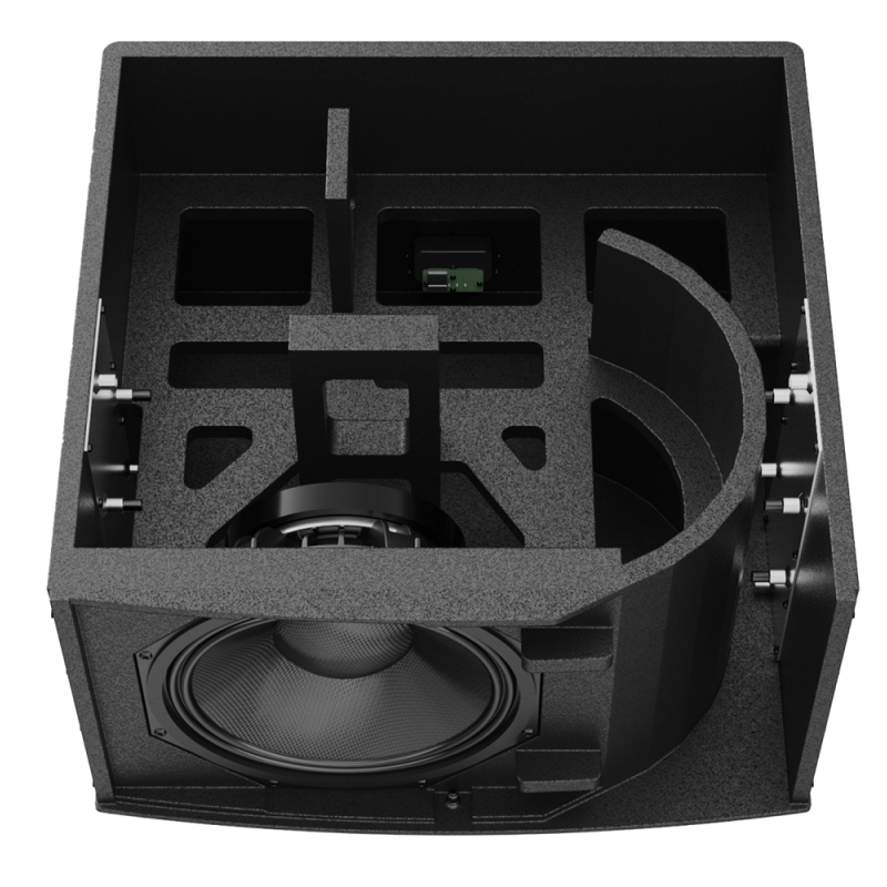 На тыльной части корпуса предусмотрены два разъема (клеммный терминал), один из которых используется для подключения к усилителю, а другой для следующего сабвуфера. Корпус выполнен из многослойной фанеры толщиной 18 мм и покрыт полиуретаном, динамик защищает мелкоячеистая металлическая решетка. Габаритные размеры 758x550x798 мм, вес 45 кг. Монтаж напольный (ножки) или подвесной (12x M10). На сабвуфер можно устанавливать акустическую стойку (1x M20). Эксплуатация в помещениях. Черный цвет (RAL9004).