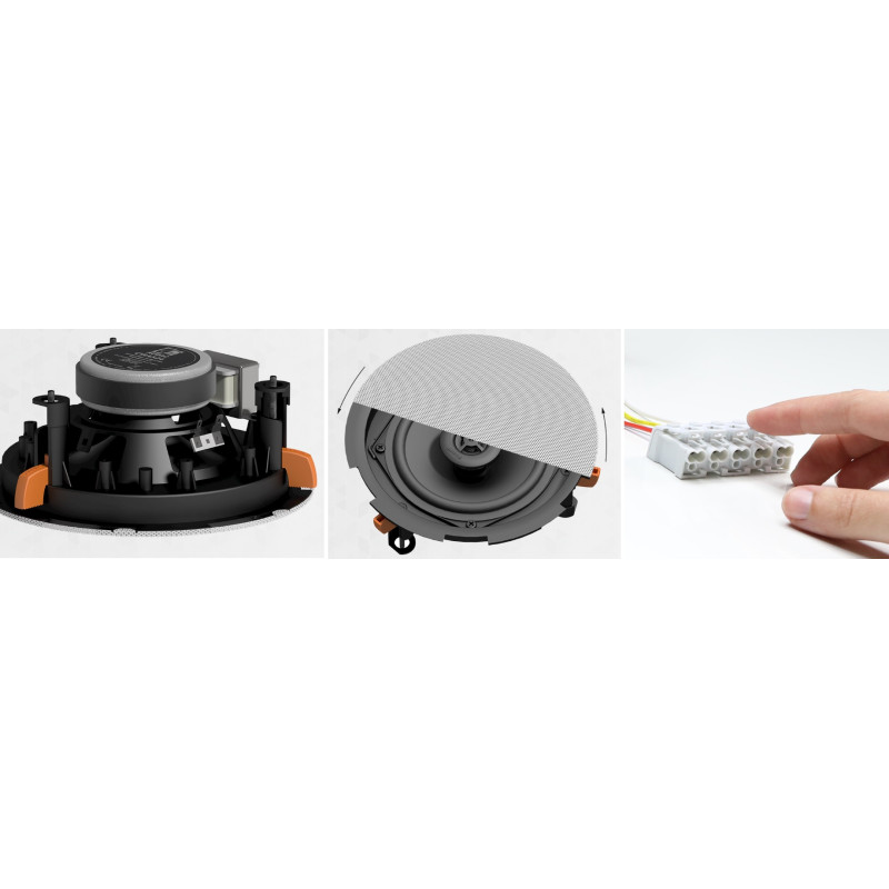 Корпус акустической системы сделан из прочного и легкого ABS-пластика, способного работать в диапазоне температур от -20 до +60 градусов. Для защиты динамиков предусмотрен мелко перфорированный гриль с механизмом TwistFix, который позволяет легко разобрать устройство. Гриль также обеспечивает плавный и незаметный переход от полотка к поверхности АС. Вход для коммутации с источником звука выполнен на коннекторе Multi-tap Fast-con. Крепление в монтажном отверстии осуществляется с помощью фирменной технологии QuickFit.