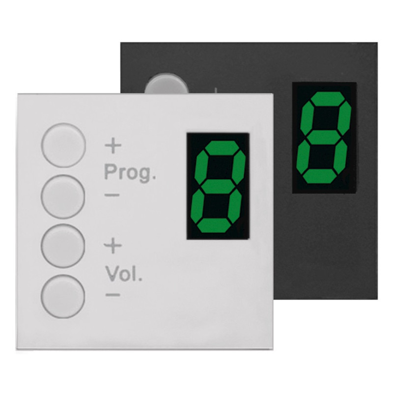 AUDAC MWX45 – встраиваемая настенная панель для удаленного управления матричными аудио коммутаторами AUDAC MTX48 и MTX88, усилителем мощности AMP523MK2 или сетевым прибором управления аудио входами RM523 непосредственно из зоны трансляции. Она позволяет выполнять выбор канала вещания и настройку необходимого уровня громкости, отображает текущие действия и настройки на встроенном 7-сегментном светодиодном дисплее. Выполнена в стильном малогабаритном корпусе из ABS пластика и предполагает врезной монтаж с применением установочных рамок производства AUDAC, Legrand, Niko и др. Подключение к основному оборудованию выполняется по RS-485 (4-pin клеммный блок) кабелем UTP CAT5 и выше длиной до 500 м.