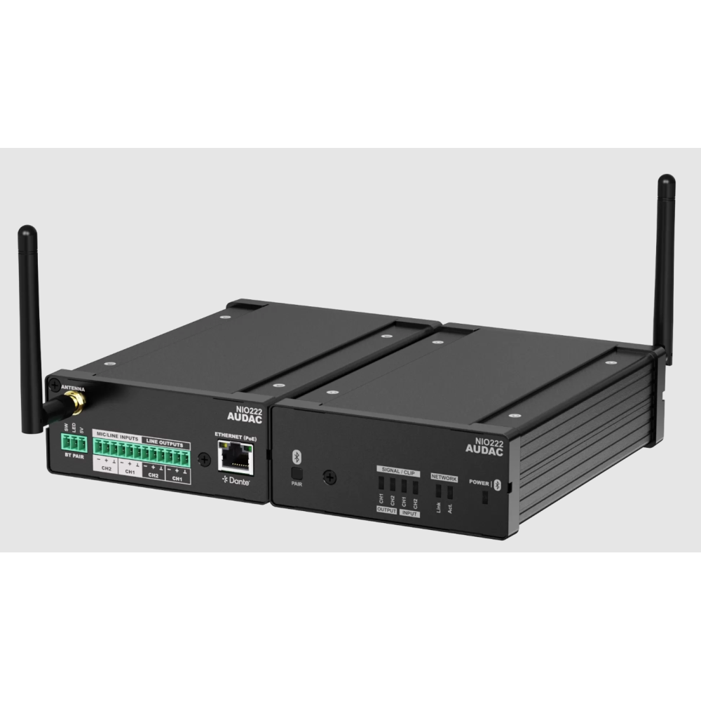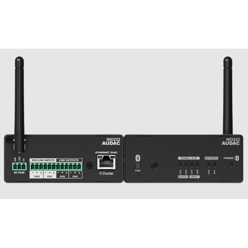 AUDAC NIO222 – Сетевой модуль предназначенный для коммутации (микширования) сигналов с шести различных (цифровых и аналоговых) аудиовходов на шесть различных (цифровые и аналоговые) аудиовыходов с обработкой звука встроенным цифровым аудиопроцессором (DSP).