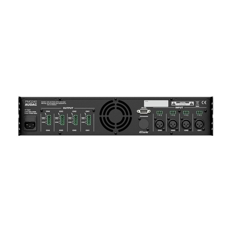 Задняя панель снабжена аудиовходами на разъемах XLRf и Euroblock 3-pin, клеммниками Euroblock 4-pin для подключения 100 В линий АС и портом RS-232 для внешнего удаленного управления. Дополнительно предусмотрена возможность установки опционального сетевого интерфейса Dante™, позволяющего выполнять прием/передачу звукового сигнала высокого качества и с минимальной задержкой по стандартной сети Ethernet.