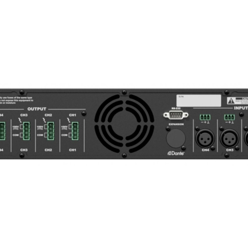 Задняя панель снабжена аудиовходами на разъемах XLRf и Euroblock 3-pin, клеммниками Euroblock 4-pin для подключения 100 В линий АС и портом RS-232 для внешнего удаленного управления. Дополнительно предусмотрена возможность установки опционального сетевого интерфейса Dante™, позволяющего выполнять прием/передачу звукового сигнала высокого качества и с минимальной задержкой по стандартной сети Ethernet.