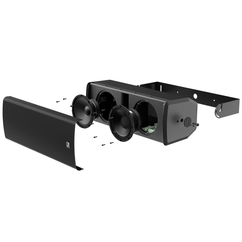 Оборудована тремя динамиками: 1,4” ВЧ коаксиальный компрессионный драйвер и 2х8” НЧ вуферы (один с 2" звуковой катушкой, а второй с катушкой 1,4"). Работают в широком диапазоне частот 46 Гц - 20 кГц и способны выдавать в обычном режиме работы звук высокой мощности 400 Вт (1600 Вт в пике) при подключении к низкоомному усилителю (импеданс 4 Ома). Акустическую систему также можно применять в трансляционных линиях с напряжением 70/100В, если установить модуль трансформатора TRM124.