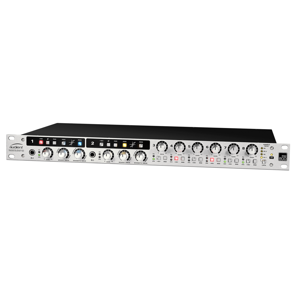 Audient ASP800 - 8-канальный микрофонный предусилитель с фирменными микрофонными предусилителями Audient, лидирующим в своём классе профессиональным АЦП/ЦАП Burr-Brown, двумя мосфетными высокоомными входами и возможностями цифрового управления по протоколу ADAT.