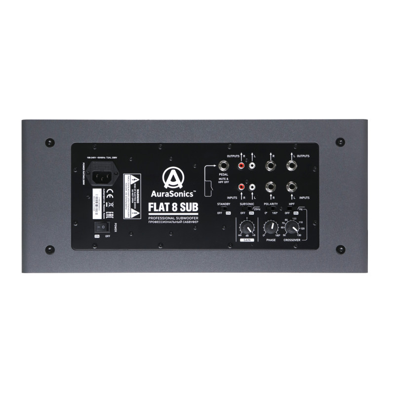К особенностям модели AuraSonics FLAT 8 SUB относятся: - плоский корпус с возможностью его установки в 5 положений - оригинальный сквозной симметричный порт фазоинвертора AuraSonics TSP, препятствующий попаданию внутрь корпуса пыли и посторонних предметов - автоматический энергосберегающий режим, который включается/выключается по звуковому сигналу - вход TS-Jack для дистанционного включения/выключения звука - встроенный стереокроссовер для сабвуфера и АС с изменением частоты раздела и возможностью отключения фильтра верхних частот - переключатель инверсии фазы и регулятор плавного изменения фазы - наличие обрезного фильтра инфранизких частот 25 Гц - наличие профессиональных балансных входов/выходов на разъёмах TRS-Jack 6,3 mm и небалансных входов/выходов RCA - совместимость с настенным креплением VESA 200x200 мм