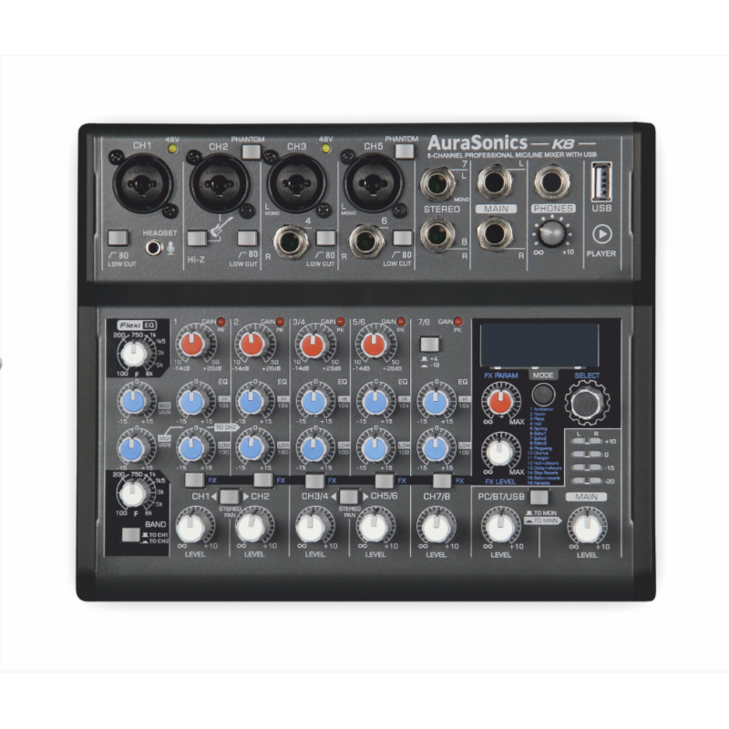 Уникальный Flexi-эквалайзер AuraSonics имеет две универсальные полупараметрические полосы, перекрывающие весь диапазон средних частот от 100Гц до 8кГц. Эти полосы могут перераспределяться между первым и вторым каналом и предоставляют пользователю либо один канал с четырёхполосным эквалайзером и двумя регулируемыми СЧ-полосами, либо два идентичных канала с трёхполосными эквалайзерами с одной регулируемой СЧ-полосой. Это позволяет очень точно скорректировать звук основного микрофона вокалиста или тембр сольных инструментов, что невозможно сделать ни на одном другом компактном микшере в этой ценовой категории.