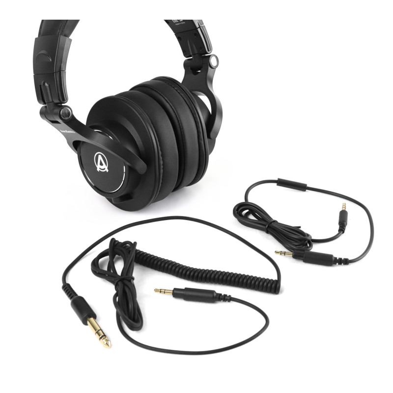 В комплекте поставляются два сменных кабеля: прямой и спиральный. Прямой с разъёмами mini-Jack 3,5 мм, спиральный с разъёмами двух типов на концах: Jack 3,5 мм и Jack 6,3 мм. Ответные разъёмы для подключения кабеля находятся на чашах наушников. Такое решение позволяет подключаться к выходам Jack двух типов, не используя дополнительные переходники. На прямом кабеле расположен микрофон, который позволяет вести разговор при подключении наушников к телефону